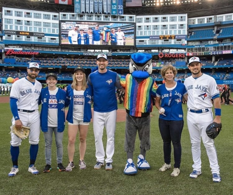 Worth noting, Blue Jays center fielder Kevin Pillar was also on the field for pre-game photos with the distinguished guests, including Platt. After making an unfortunate homophobic slur in the heat of battle during the 2017 season against Atlanta Braves reliever Jason Motte, Pillar’s public apology and donation to PFLAG and Toronto’s branch of You Can Play, took on greater meaning with his on-field appearance.