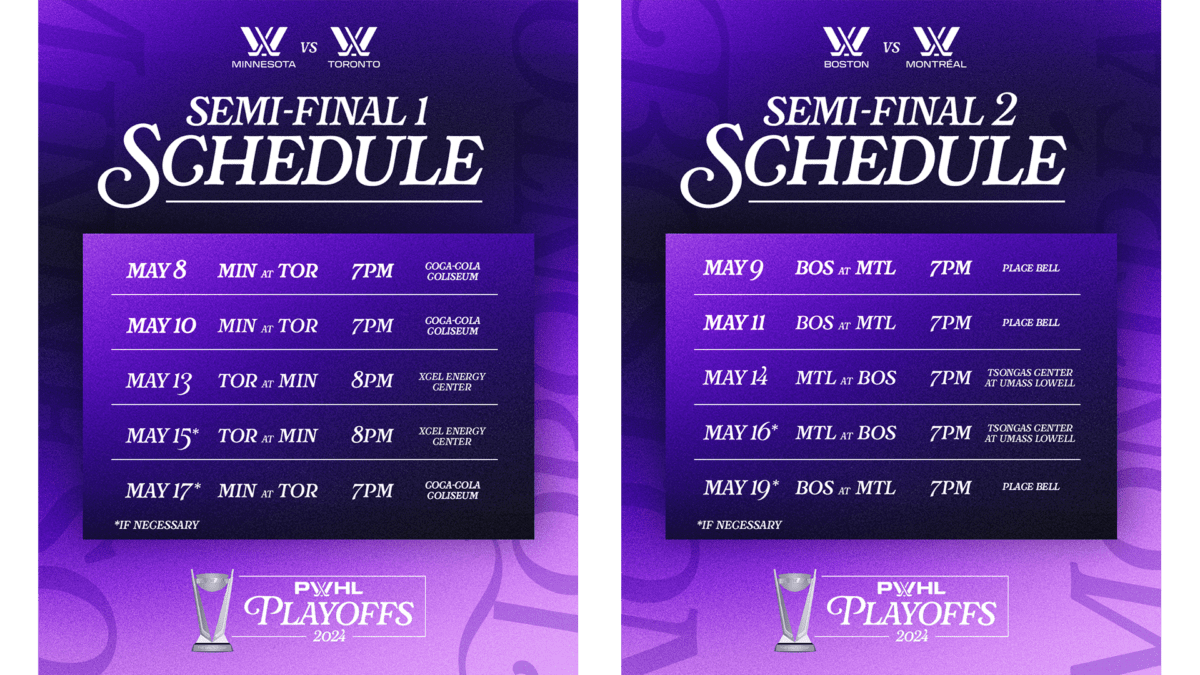 NEW YORK AND TORONTO (May 6, 2024) – Four Professional Women’s Hockey League (PWHL) teams are Chasing the Championship with the inaugural PWHL Playoffs set to begin May 8. The two best-of-five semifinal series will feature PWHL Toronto against PWHL Minnesota, and PWHL Montréal against PWHL Boston.