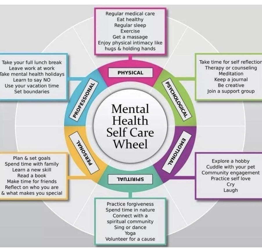 When engaging in self-care, Barb advises a multi-faceted approach from the “Mental Health Self-Care Wheel”, developed by the British Columbia Association of Clinical Counselors.